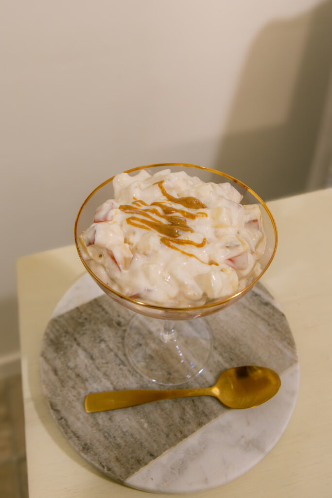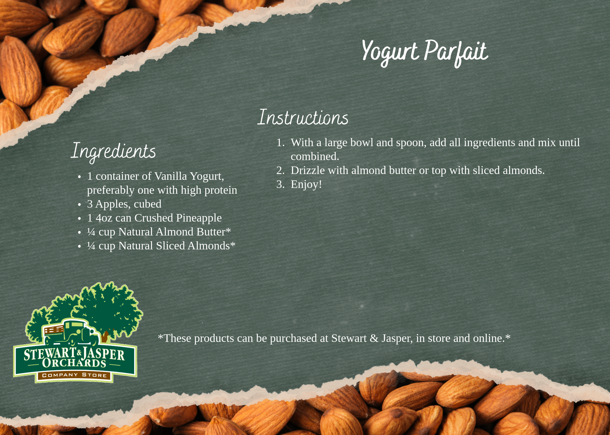Layered with silky vanilla yogurt, a drizzle of natural almond butter, and a bright mix of crisp apple and crushed pineapple, this parfait is the perfect balance of creamy, fruity, and lightly nutty. Each spoonful brings a refreshing sweetness from the fruit and a satisfying crunch from natural sliced almonds. Simple, wholesome, and naturally delicious—this parfait makes an energizing breakfast or a feel-good snack any time of day.